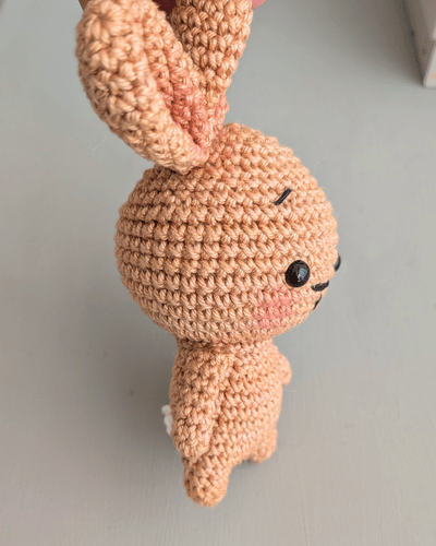 Ich wollte beide Ohren auf eine Seite nähen, daher habe ich mich entschlossen ein Ohr etwas kürzer zu häkeln. Natürlich kannst du die Ohren so gestalten wie du magst. Das kurze Ohr ist nur eine Option 😉