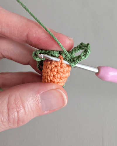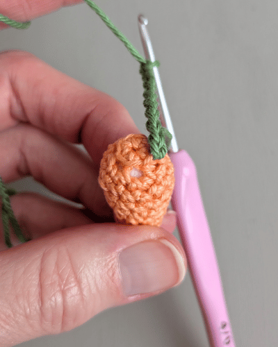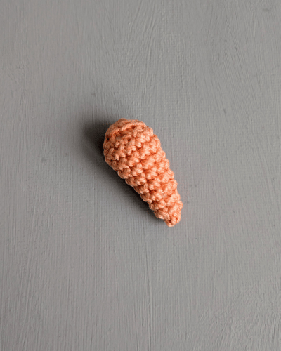 Beginne mit Orange und häkle in Spiralrunden. Stopfe deine Karotte fortlaufend mit Füllwatte.