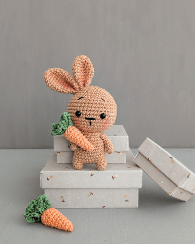 Du hast es geschafft!!! Ich hoffe, du hattest viel Freude beim Häkeln und nun wünsche ich dir viel Spaß mit deinem kleinen Osterhasen, der entweder verschenkt wird oder bei dir einziehen darf. Wie ich die Möhre gehäkelt habe, verrate ich dir weiter unten.