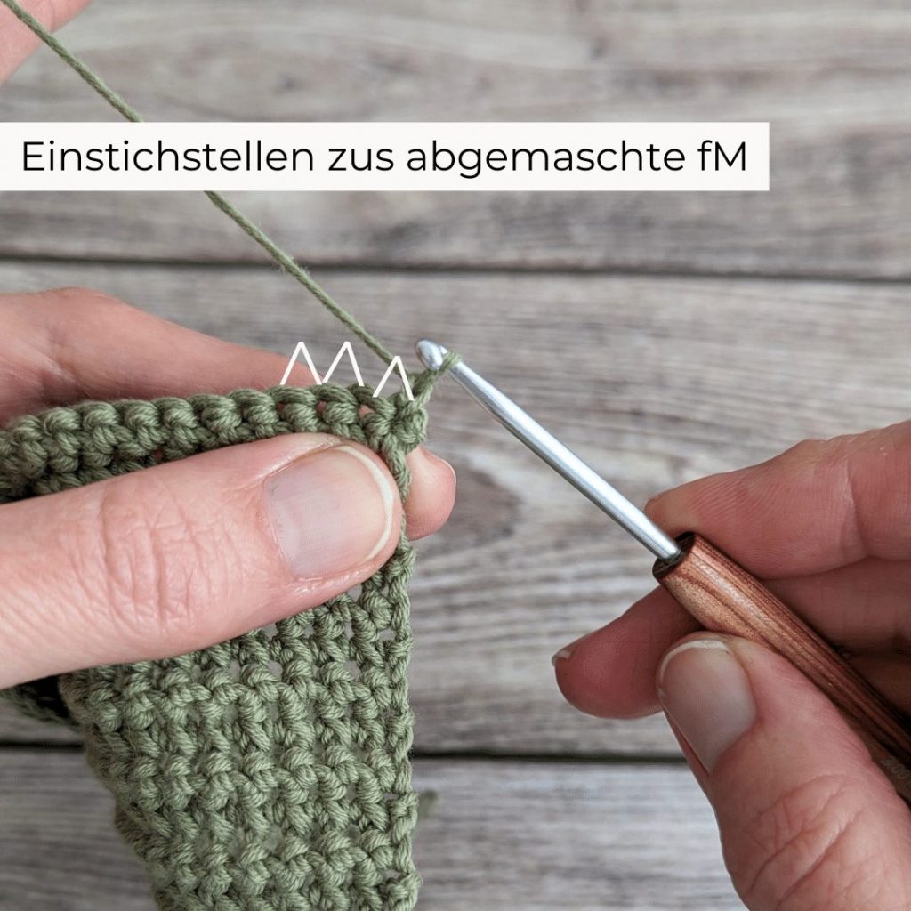 Du kannst am Ende deiner R immer eine M zunehmen, indem du eine weitere zusätzliche fM am Ende häkelst. Eine Abnahme häkelst du, indem du die letzte fM nach dem letzten Knotenstich in der R einfach weglässt.