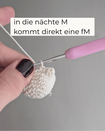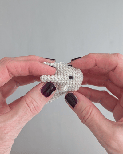 Sticke mit einem schwarzen Faden die Augen vorne, mittig zwischen die Arme. Du stickst über die 7. Rd mit einem Abstand von 4 M zwischen den Augen. Verknote den Faden innen gut und vernähe ihn so, dass man ihn von außen nicht sehen kann.