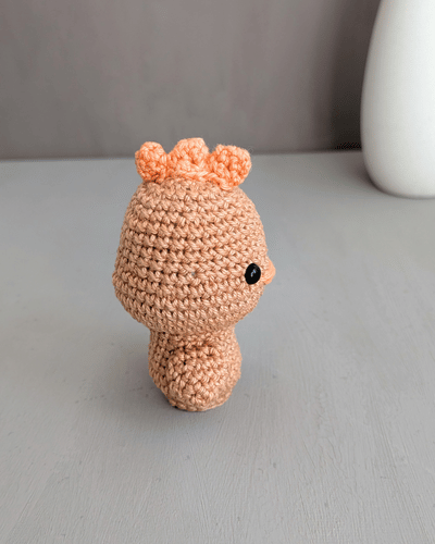 Jetzt drehst du dein Küken auf den Kopf und kettest auf der Rückseite in einer vorderen M der 3. Rd. neu an und häkelst 18 fM.