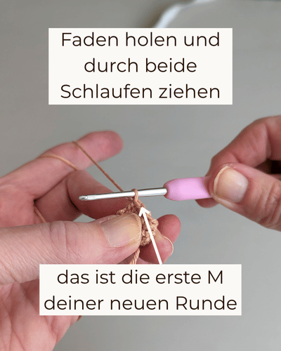 Stich nun in das erste Bein ein und häkle 1 fM. Diese fM ist die erste M der neuen Runde. Am besten du markierst sie dir mit einem MM. Häkle nun weiter wie folgt: