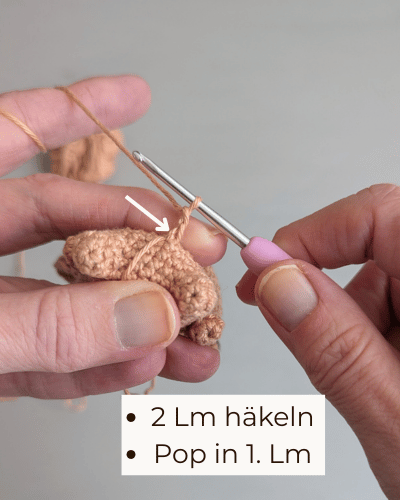 Kette am Rücken unten mittig zwischen zwei Maschen mit Hellbraun neu an. Häkle zwei Lm. In die 1. Lm häkelst du jetzt eine Popcornmasche aus 4 halben Stäbchen. Faden abschneiden und abketten.