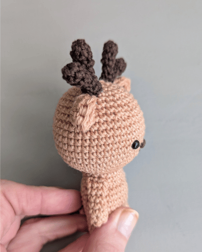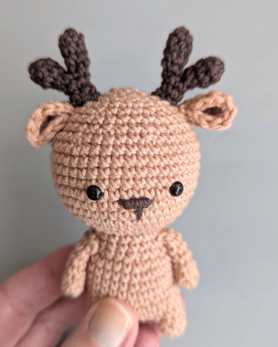 Hinweis: Häkle in Spiralrunden. Stopfe deine Arbeit kontinuierlich mit Füllwatte aus. Das Geweih und die Arme werden nicht ausgestopft. Der Körper und der Kopf werden in einem Stück gehäkelt. Im Anschluss werden die Arme, die Ohren und das Geweih angenäht. Der kleine Schwanz wird im Anschluss hinten mittig angehäkelt.