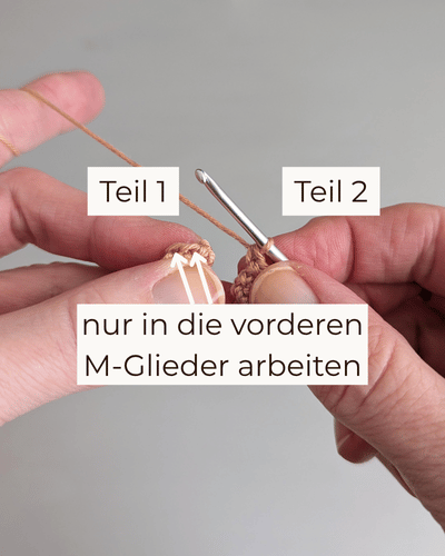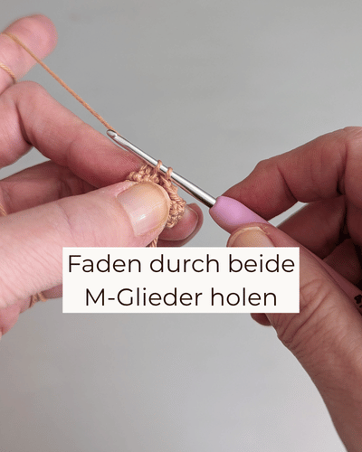 Faden abschneiden und durch alle vorderen M-Glieder fädeln und fest zuziehen. Faden vernähen.