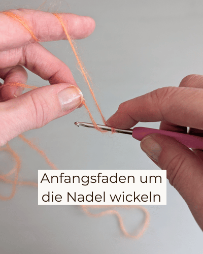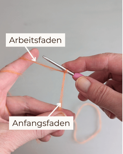 Lasse einen langen (ca. 1 m) Anfangsfaden, mache einen Anfangsknoten in dein Garn und häkle dann eine ca.