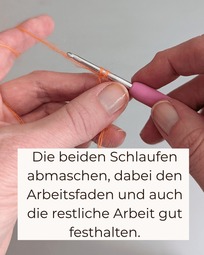Dafür legst du deinen langen Anfangsfaden von vorne nach hinten über deine Häkelnadel – vor deine Arbeitsschlaufe. Du hast jetzt quasi zwei Schlaufen auf deiner Nadel. Nun musst du den Anfangsfaden, wie auch die Arbeit gut festhalten. Hole den Arbeitsfaden durch beide Schlaufen durch. Diesen Vorgang wiederholst du nun so lange, bis dein Schal die gewünschte Länge hat.